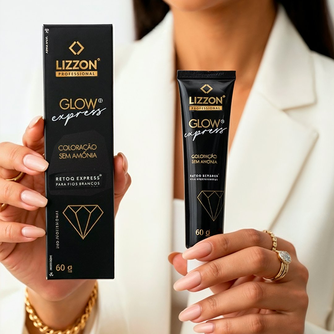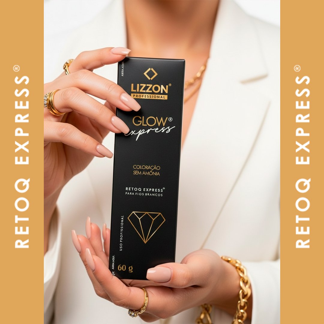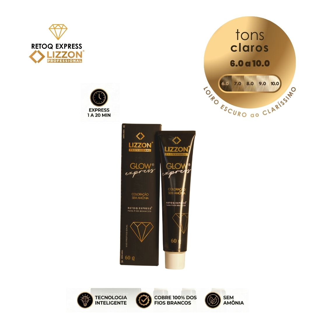São mostrados uma caixa preta e dourada e um tubo do Bisnaga Retoq Express (Tons Claros). A embalagem informa que ele é para tons loiros claros, cobre cabelos grisalhos, funciona em 20 minutos e não contém amônia.