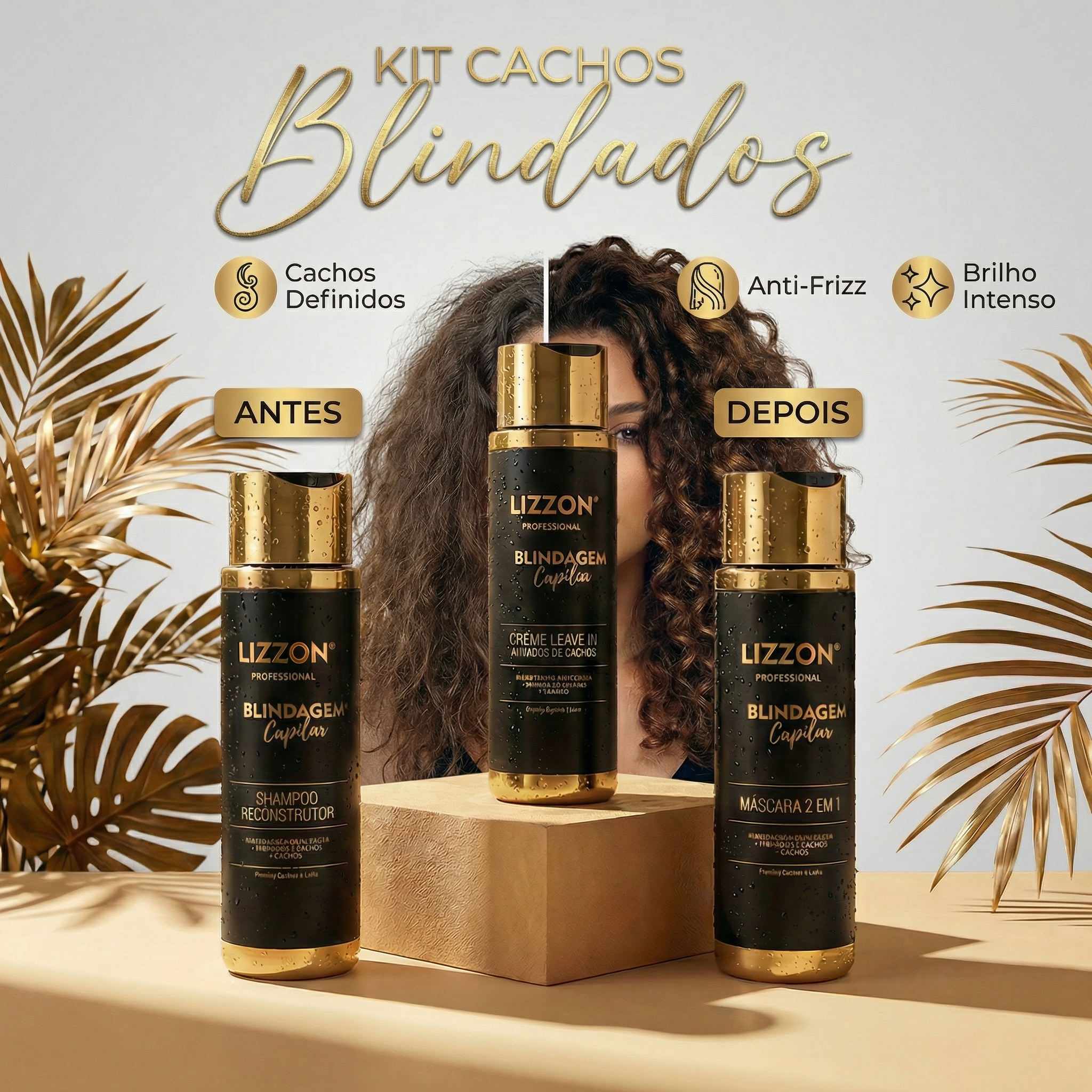 Um mostruário do Kit Cachos Blindados (homecare) 10 unidades (cópia) em embalagens douradas e pretas, oferecendo um combo profissional 20x para proteção de cabelos cacheados, desempenho máximo e economia garantida.