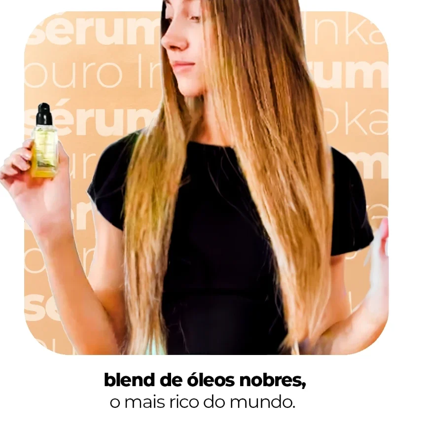 Dez frascos de ouro inka (Combo 10x) (preto) estão alinhados; acima deles, banners dourados exibem "ouro inka", "soro de tratamento avançado" e "Combo 10x" com um ícone de brilho.
