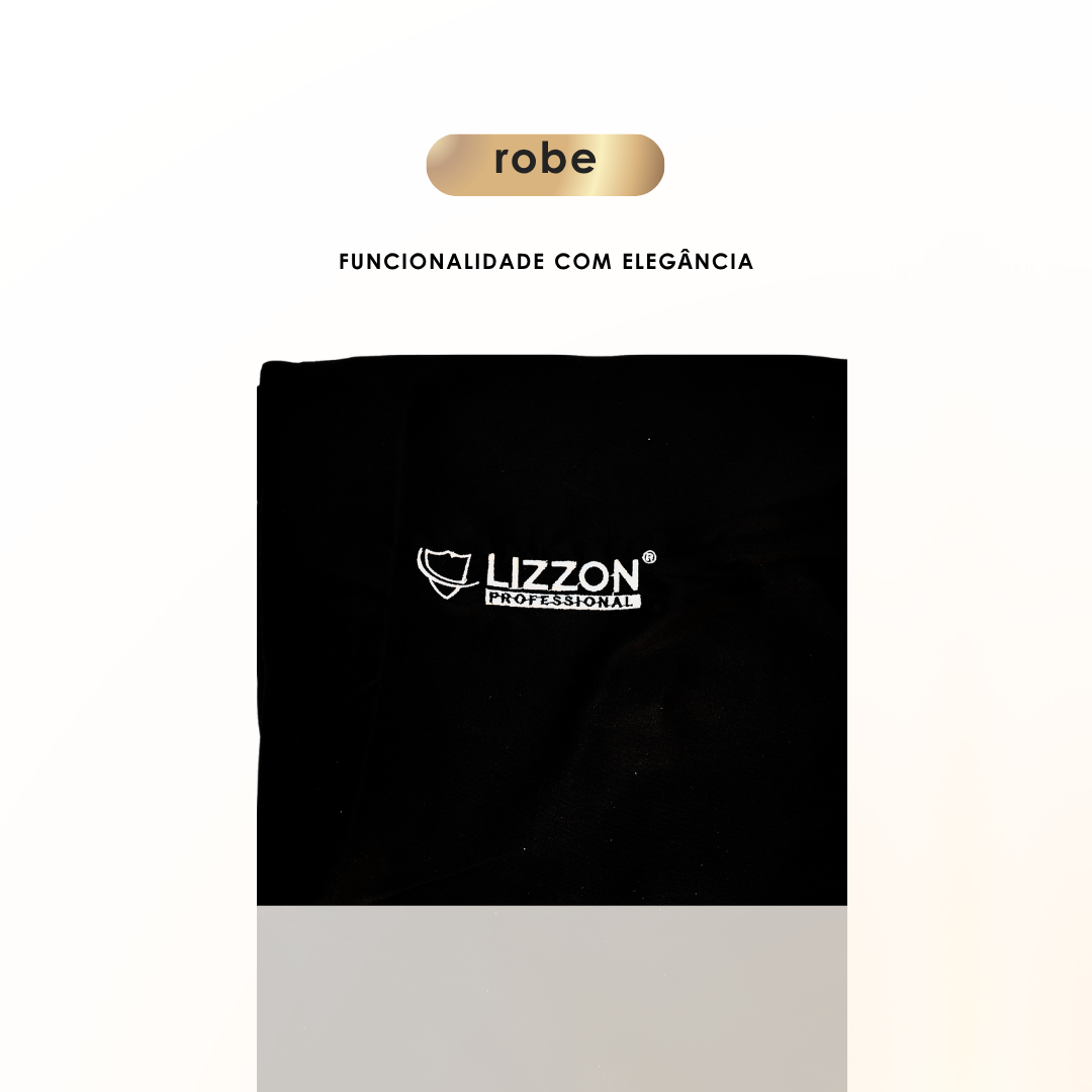 O Robe Lizzon Professional preto e liso está dobrado sobre um fundo branco. Acima, leia-se: roupão e FUNCIONALIDADE COM ELEGÂNCIA.