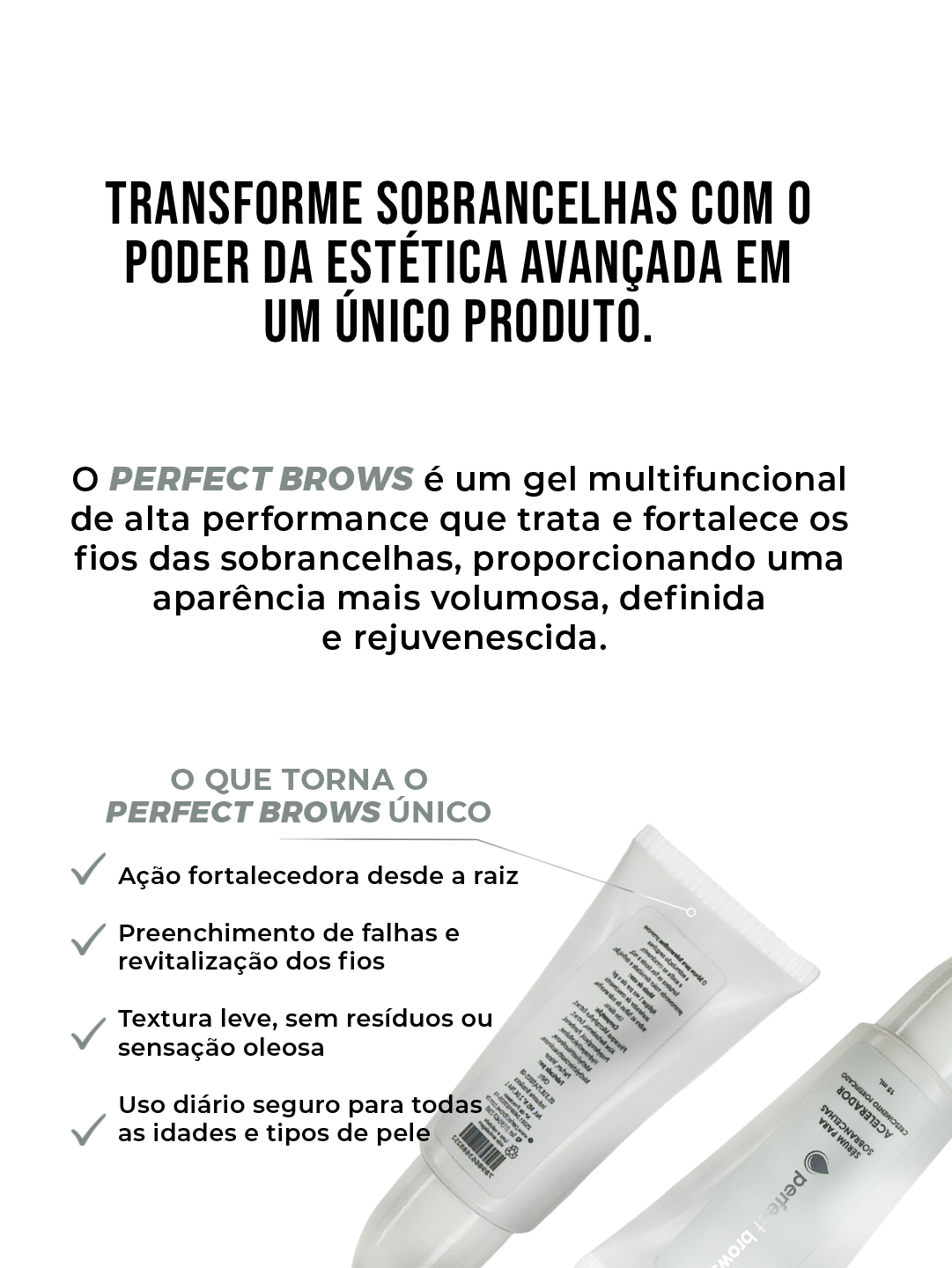 O Perfect Brows é um gel multifuncional de alta performance que trata e fortalece os fios das sobrancelhas, proporcionando uma aparência mais volumosa, definida e rejuvenescida.
