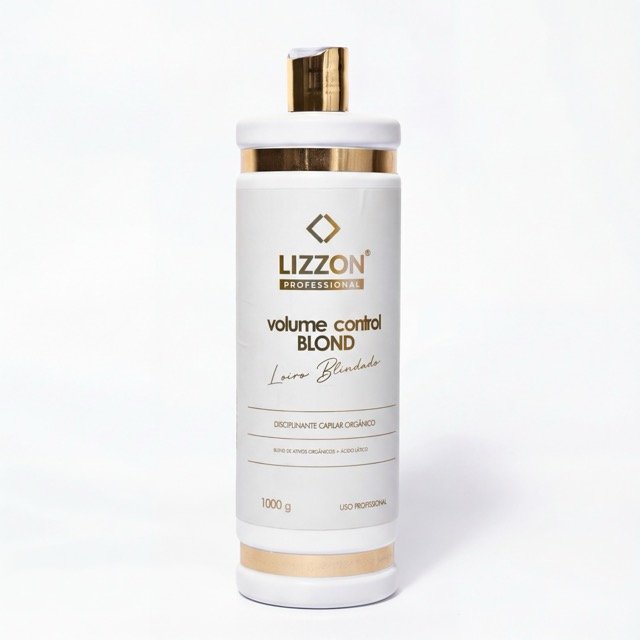 Um frasco branco e dourado com o rótulo Lizzon Professional Volume Control Blond e texto adicional em português. O frasco tem uma tampa dourada e contém 1.000 gramas de produto para cabelo.